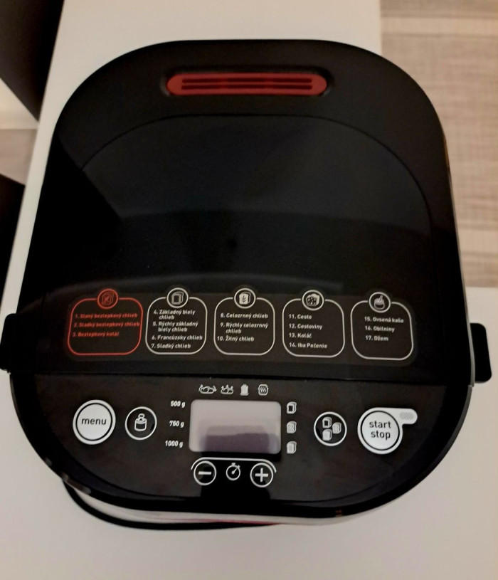 nie ingrediencií, 17 programov (3 programy na bezlepkové pečenie, tvorba cesta, zaváranie, funkcia udržania teploty), príkon 650 W. Pekáreň je v dobrom stave, málo používaná.