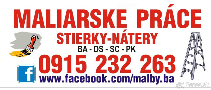 Ponúkam odborné maliarske a natieračské práce interiérov a exteriérov – byty, domy a nebytové priestory, schodiská, renovácie starých maľoviek, odstraňovanie plesni a protiplesňové nátery, výspravky po elektrikároch, stierky, fasádne nátery, menšie murárske a zateplovacie práce, opravy omietok, búracie práce, nátery drevených a kovových konštrukcií aj vo výškach, maliarske práce po zatečeniach aj cez poisťovne, odborné poradenstvo, v rámci prác vám viem zabezpečiť dodanie elektro inštalácie, elektro montáže a opravy. Kontakt 0915 232 263 aj cez WhatsApp a Viber. Niektoré naše práce a recenzie na www.facebook.com/malby.ba email: danis.stav@gmail.com Pôsobíme v okresoch BA, SC, DS, PK, GA. Dlhoročná prax a skúsenosti s danými prácami, záruka serióznosti , odbornosti a kvality 👌