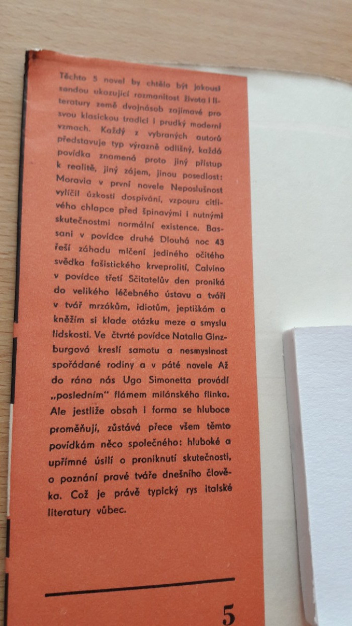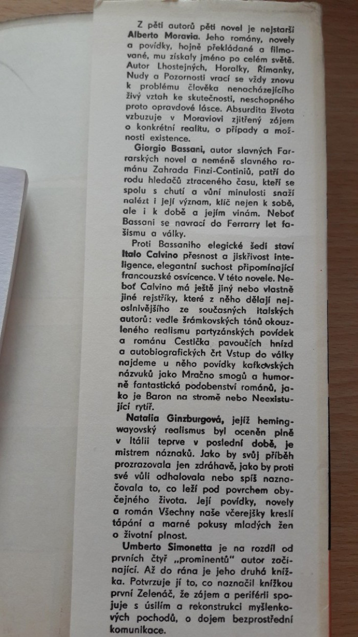 Autori: Alberto Moravia, Giorgio Bassani, Italo Calvino, Natalia Ginzburgová, Umberto Simonetta. Odeon 1967, Klub čtenářů. Dobrý stav. Cena 1,--+poštovné. Pozrite si aj ostatné moje inzeráty