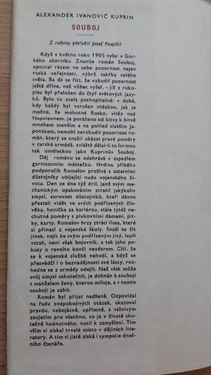 Román z obdobia konca 19. a začiatku 20. storočia o cárskej posádke v zapadnutom mestečku. Vojaci sa nudia pri neustále opakovanom drile, ktorý stráca zmysel. Sú znechutení zo surových dôstojníkov, ktorí v nich už ani nevidia ľudí, ich pitiek a aférkami so ženami. Státní nakladatelství krásné literatury, hudby a umění, 1957, Klub čtenářů. Dobrý stav. Cena 1,--+poštovné. Pozrite si aj ostatné moje inzeráty