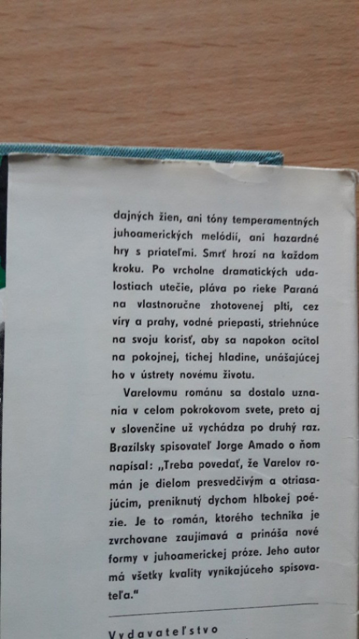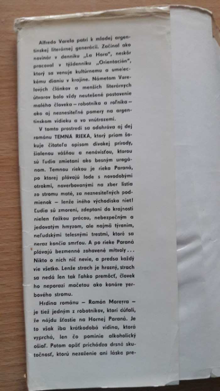 Román z argentínskeho vidieka, z oblasti pri rieke Paraná. Hrdina románu hľadá šťastie na Hornej Paraná ako zberač lístia stromu maté. Zberači pracujú v neznesiteľných podmienkach, ohrozovaný jedovatým hmyzom, zdeptaní ťažkou prácou a trestami, ktoré často končia smrťou. Prebal je v zlom stave, lepený, strany zažltnuté ale čisté. Vydalo Vydavateľstvo politickej literatúru v roku 1968. Cena 1,--+poštovné. Pozrite si aj ostatné moje inzeráty