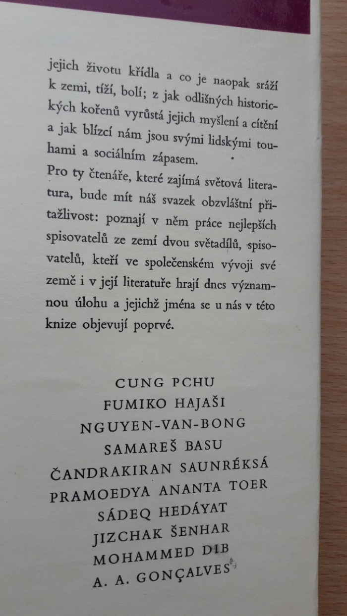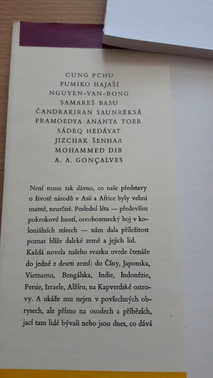 Kniha predstavuje desať noviel od autorov: Cung Pchu, Fumiko Hajaši, Nguyen-Van-Bong, Samareš Basu, Čandrakiran Saunréksá, Pramodeya Ananta Toer, Sádeq Hedáyat, Jizchak Šenhar, Mohammed Dib, A.A. Gonçalves. Vydal Československý spisovateľ 1961. Výborný stav. Cena 2,--+poštovné.