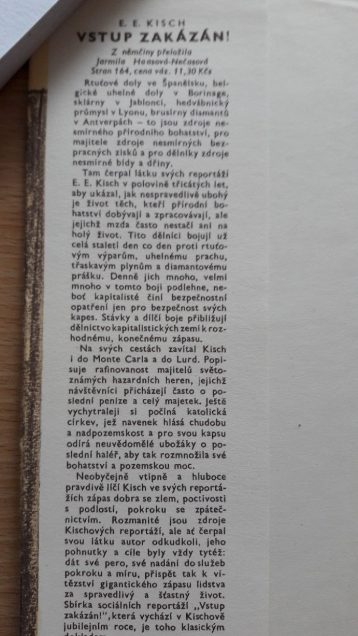 Ďalšie reportáže „zúrivého reportéra“. V knihe sa zameral na oblasti hospodárstva, kde robotníci denne bojujú z nebezpečným prostredím, napr. ortuťové bane v Španielsku, sklárne v Jablonci, brusiarne diamantov v Antverpách a pod. Vydalo Státní nakladatelství politické literatury 1955. Ušpinený prebal. Inak dobrý stav. Cena 3,--+poštovné. Pozrite si aj ostatné moje inzeráty