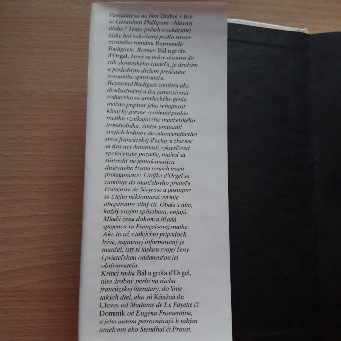 Druhý a zároveň posledný román predčasne zosnulého autora. Príbeh manželského trojuholníka z prostredia francúzskej šľachty. Prvý román spisovateľa – Diabol v tele – bol použitý ako predloha k rovnomennému filmu so Gérardom Phillipom v hlavnej úlohe. Tatran 1988, trochu ušpinený prebal inak dobrý stav. Cena 2,--+poštovné. Pozrite si aj ostatné moje inzeráty