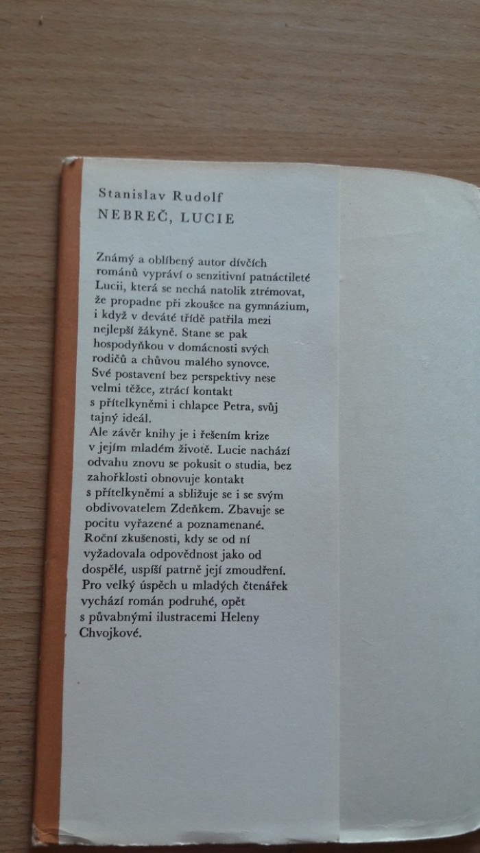 Príbeh pätnásťročnej Lucie, ktorá sa nechá tak strémovať, že prepadne pri skúške na gymnázium aj keď patrila medzi najlepšie žiačky. Stará sa preto o domácnosť svojich rodičov a malého synovca. Paradoxne jej táto skúsenosť pomôže k zmúdreniu. Vydal Československý spisovatel v roku 1977, ilustrovala Helena Chvojková. Dobrý stav, na prebale len malé známky používania. Cena 1,--+poštovné.