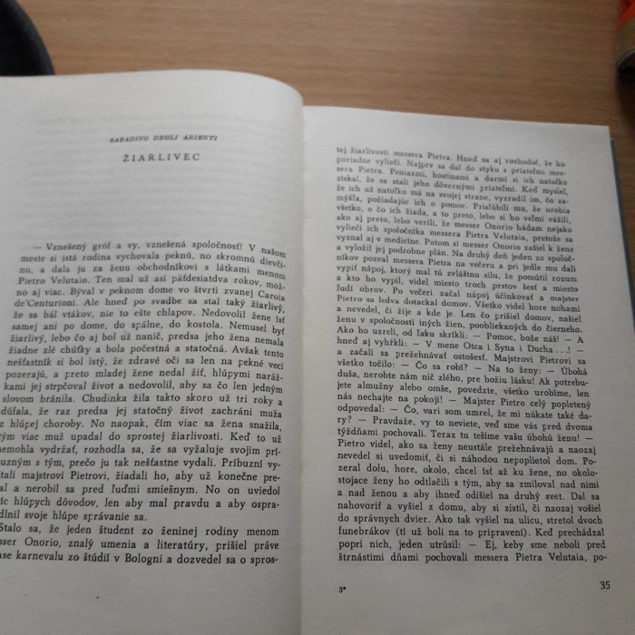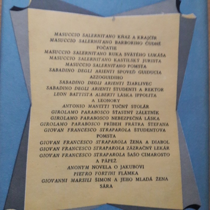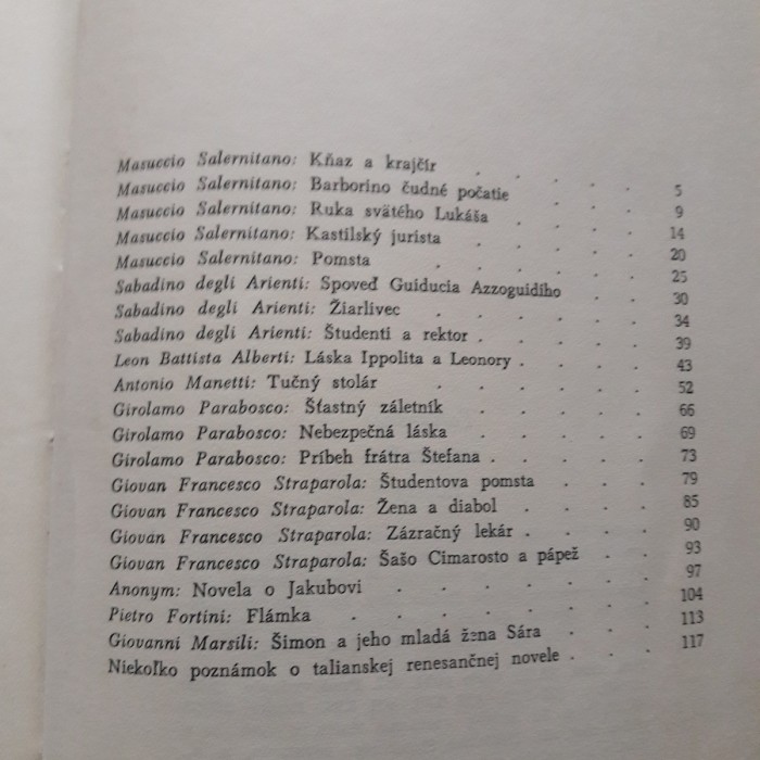 Novely od autorov: Masuccio Salernitano, Sabadino degli Arienti, Leon Battista Alberti, Antonio Manetti, Girolamo Parabosco, Giovan Francesco Straparola, Anonym, Pietro Fortini, Giovanni Marsili. Vydal Slovenský spisovateľ 1958. Dosky sú ušpinené, prebal tiež trochu ušmudlaný, inak dobrý stav. Cena 1,--+poštovné. Pozrite aj ostatné moje inzeráty.