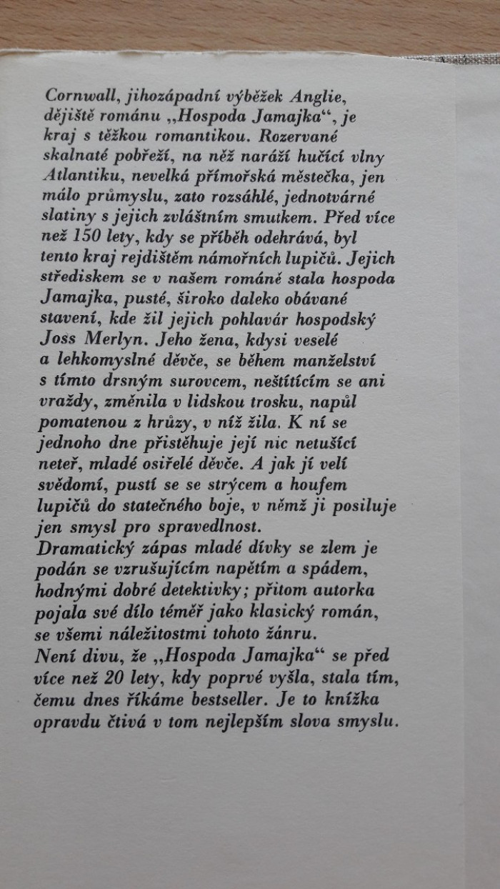 Román sa odohráva v Cornwalle, v krčme Jamajka, ktorá sa stala strediskom miestnych námorných lupičov. Za majiteľovou manželkou príde jej neter a pustí sa do zápasu so zlom. Vydal Odeon 1970, Klub čtenářů. Prebal je trochu ochytaný, inak dobrý stav. Cena 1,--+poštovné. Pozrite si aj ostatné moje inzeráty