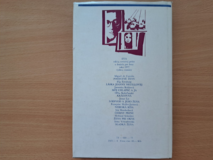 --2689-- Román o lásky. Príbeh päťdesiatosemročného spisovateľa, ktorý celý svoj život podriadil umeleckej tvorbe. Chystá sa odísť do ústrania a napísať svoje vrcholné dielo, no namiesto toho sa zapletie do zložitých citových vzťahov. Prežije osudovú lásku k mladučkej dcére svojho priateľa. Smena 1977, edícia Eva. Kniha je čistá a nepoškodená. Cena 1,-- + poštovné. Pozrite si aj ostatné moje inzeráty.