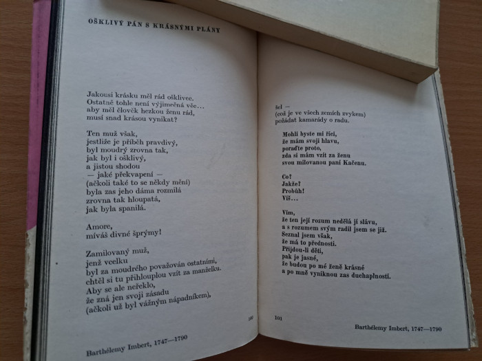 ---2033--- prebásnil Radovan Krátky. Výbor z diel francúzskych básnikov hlavne 17. a 18. storočia a zopár aj z 19. storočia. Zameriava sa hlavne na rozsiahlejšie básne anekdotického rázu. Československý spisovatel 1970. Mäkka väzba s prebalom, malý formát. Prebal je poškodený aj ušpinený, obálka ušmudlaná, strany čisté, väzba nepoškodená. Cena 2,-- + poštovné. Pozrite si aj ostatné moje inzeráty.