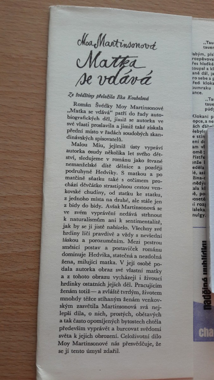 Príbeh nemanželskej dcéry chudobnej robotníčky, ktorá sa spolu s ňou a neskôr aj s otčimom pretĺkajú životom. Autorka opisuje svoje vlastné detstvo a matku. Státní nakladatelství krásné literatury a umění 1961, edícia Klub čtenářů. Prebal málinko ochytaný, inak dobrý stav. Cena 1,--+poštovné. Pozrite si aj ostatné moje inzeráty