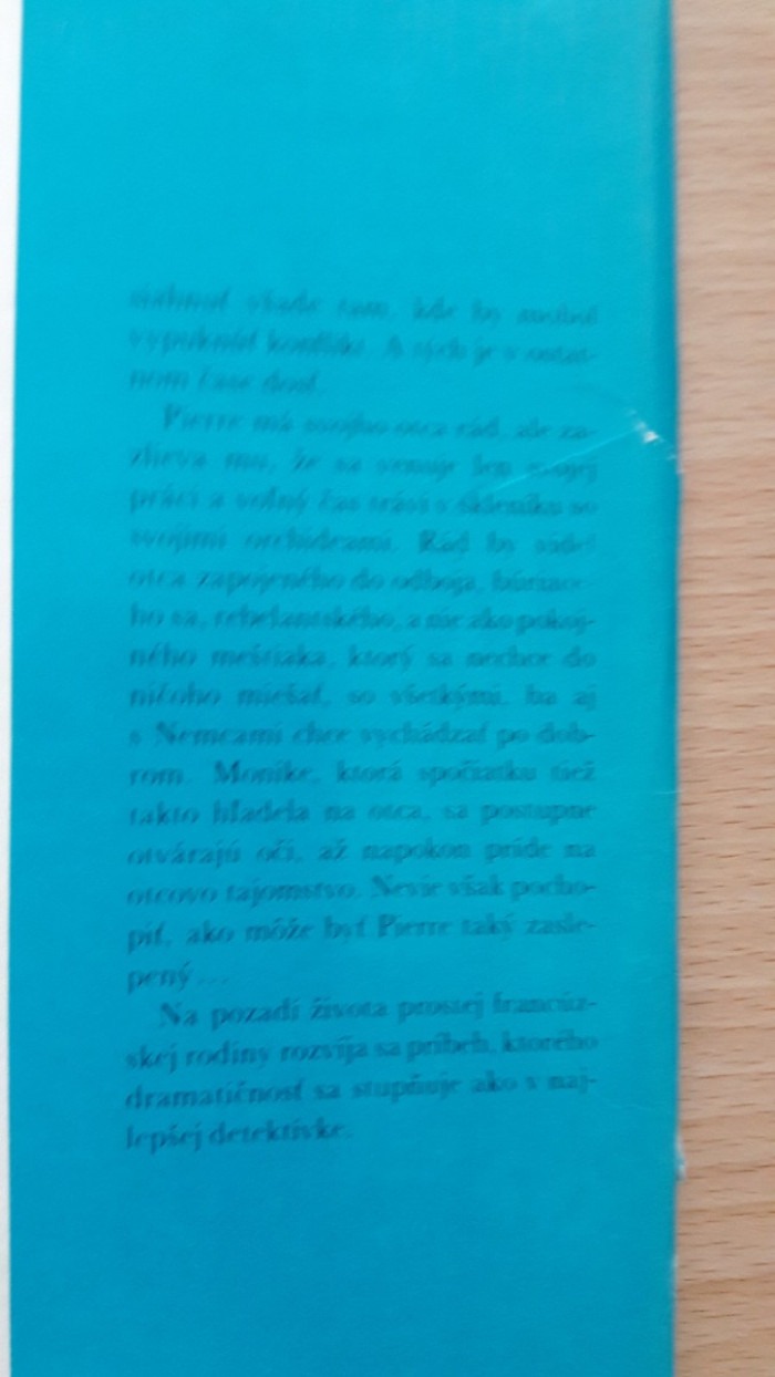 Román z konca druhej svetovej vojny odohrávajúci sa vo Francúzsku. Na pozadí života francúzskej rodiny sa rozvíja príbeh, ktorého dramatičnosť sa stupňuje ako v najlepšej detektívke. Príbeh bol sfilmovaný. Autorom je známy herec, scenárista a režisér, vlastným menom Lucien Noël. Mladé letá 1980. Prebal je zažltnutý a poškodený, dosky trochu ušpinené. Na jednej strane počmárané ceruzkou, inak dobrý stav. Venovanie. Cena 1,--+poštovné. Pozrite si aj ostatné moje inzeráty