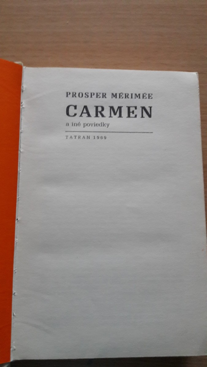 Novela Carmen inšpirovala Georgesa Bizeta k napísaniu opery Carmen. Tatran 1969, bez prebalu, dosky ušpinené, s venovaním , niekoľko podčiarknutých viet. Cena 1,--+poštovné. Pozrite si aj ostatné moje inzeráty