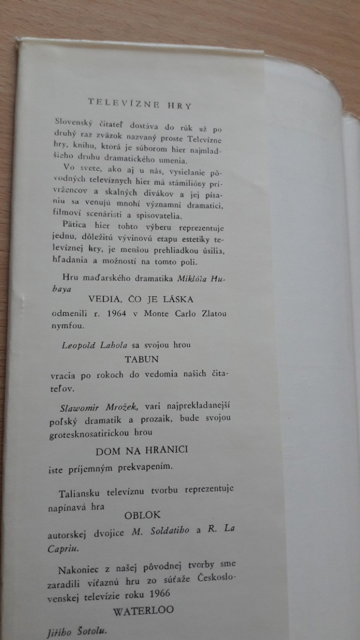 Výber obsahuje päť hier: Miklós Hubay: Vedia, čo je láska, Leopold Lahola: Tabun, Slawomir Mrožek: Dom na hranici, M.Soldati a R.La Capria: Oblok a Jiří Šotola: Waterloo. Tatran 1967. Dobrý stav. Cena 2,--+poštovné. Pozrite si aj ostatné moje inzeráty.