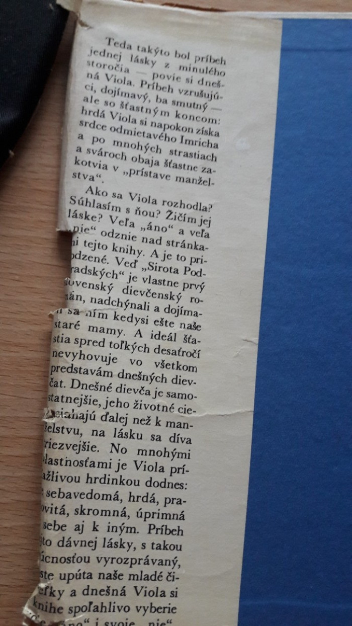 Prvý slovenský román napísaný ženskou autorkou. Príbeh polosiroty Violy, ktorej otca obvinia z podpaľačstva a ubijú na smrť. Ponižovaná a ohrdnutá vyrastá u svojho ujca a ako dospelá sa snaží očistiť otcove meno. Mladé letá 1964. Dosky sú ušpinené, prebal poškodený, inak dobrý stav. Cena 0,50 +poštovné. Pozrite si aj ostatné moje inzeráty