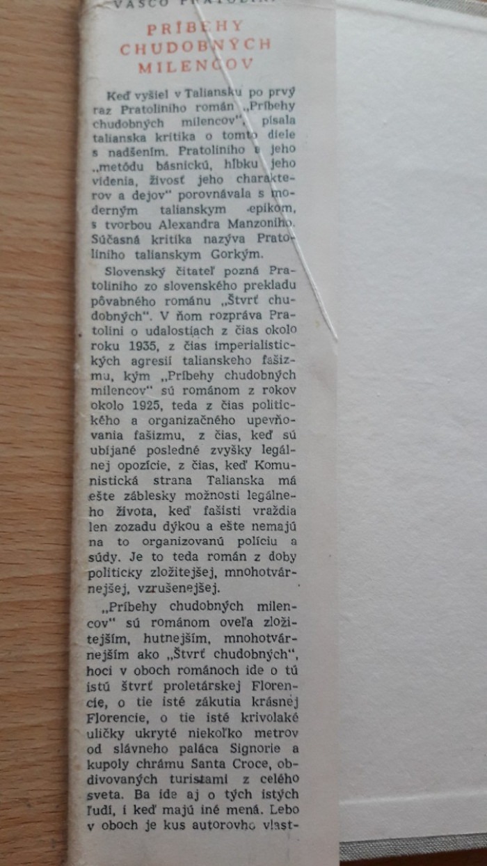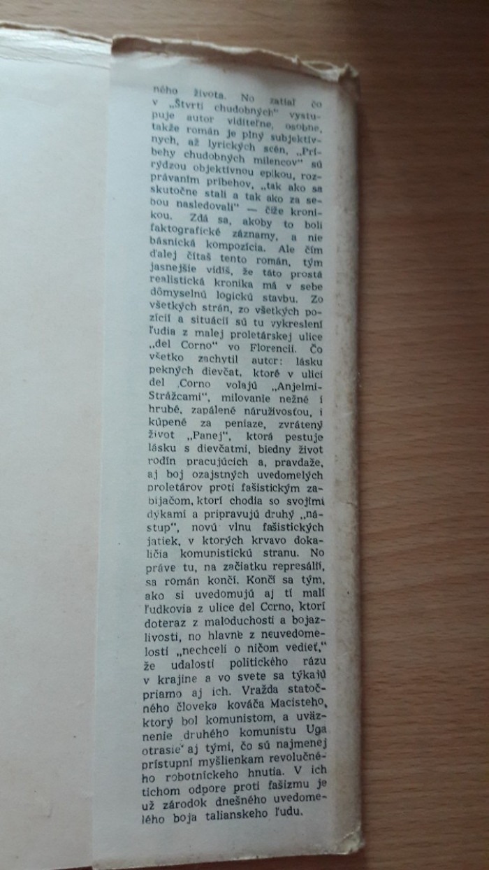 Román z prostredia chudobnej florentskej štvrte v rokoch 1925-1926. Slovenský spisovateľ 1956. Prebal je poškodený a trochu ušpinený, na stranách zboku škvrny, väzba je v poriadku. Cena 1,--+poštovné. Pozrite si aj ostatné moje inzeráty