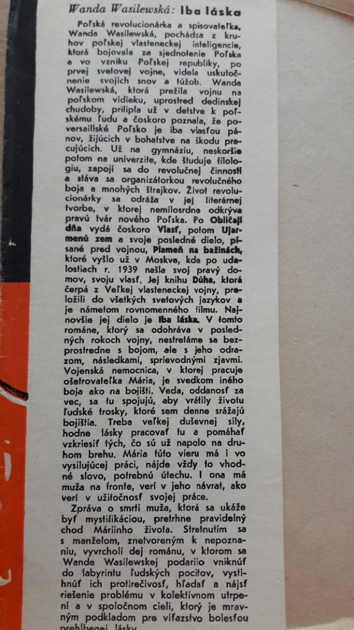 Román sa odohráva v posledných rokoch vojny. Nie je však o bitvách, bojoch ale o ich následkoch, odrazoch, o sprievodných javoch. Príbeh ženy, ktorá sa musí počas vojny, okrem iného, vyrovnať s tým, že má muža na fronte, so správou o jeho smrti, ktorá sa ukáže ako nepravdivá. Mäkká väzba, prebal je poškodený a ušpinený, škvrny sú aj na stranách, väzba v poriadku. Cena 0,50 + poštovné. Pozrite si aj ostatné moje inzeráty