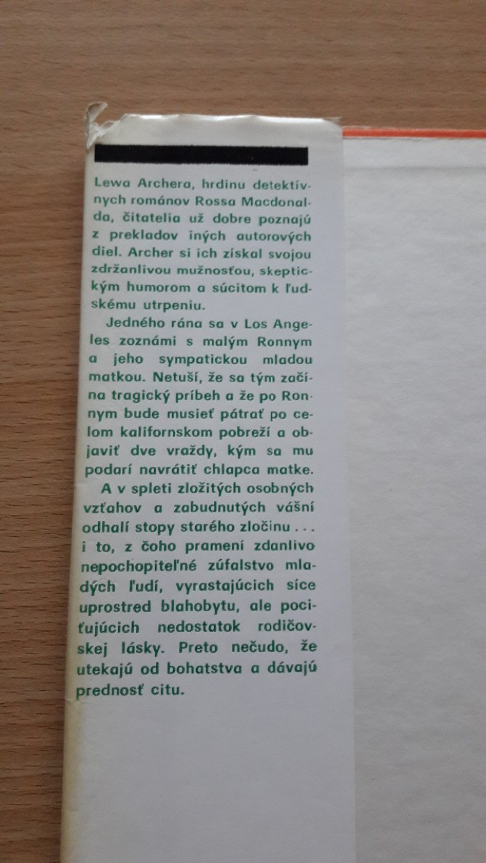 Ďalší napínavý príbeh Rossa Macdonalda s Lewom Archerom, hrdinom jeho detektívnych príbehov. Kniha je staršia, vydaná v roku 1978. Je čítaná, v poriadku, len prebal je trochu poškodený. Je to vidno na foto. Cena 1,-- + poštovné. Pozrite si aj ostatné moje inzeráty