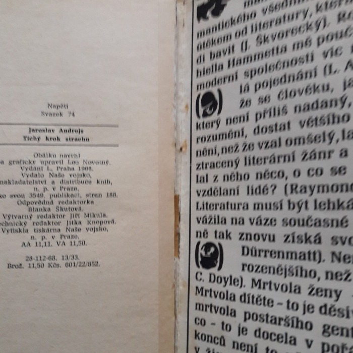 Detektívny príbeh odohrávajúci sa na horskej chate v Krkonošiach. Vyšetrovanie automobilovej nehody spôsobí samovraždu jednej ženy a neznámeho muža, ktorý sa na chate skrýva. . Naše vojsko 1968, mäkká väzba. Zvonku známky používania, zažltnuté strany, inak dobrý stav. Cena 1,--+poštovné. Pozrite si aj ostatné moje inzeráty