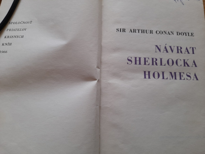 Niekoľko príbehov Sherlocka Holmesa po jeho odchode do dôchodku / Dobrodružstvo v prázdnom dome, Nezvestná lady Frances Carfaxová atď/ a z archívu S. Holmesa /Dobrodružstvo vznešeného klienta, problém Thorského mosta atď/. Vydal Slovenský spisovateľ v roku 1966, Spoločnosť priateľov krásnych kníh. Bez prebalu, dosky ušpinené, na stranách sem tam škvrna, väzba v poriadku. Cena 1,-- + poštovné. Pozrite si aj ostatné moje inzeráty