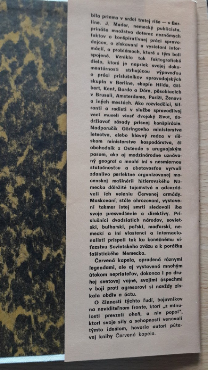 --0056--Červenou kapelou nazývali nacisti všetky vysielajúce skupiny na území Nemecka a v okupovaných krajinách, ktoré poskytovali veleniu Červenej armády dôležité informácie o zámeroch „tisícročnej ríše“. V knihe sa autori podujali priblížiť činnosť protifašistických odbojových skupín v západnej Európe. Vydala Pravda v roku 1985. Na prebale sú známky používania, dosky trochu ušpinené, inak dobrý stav. Čiernobiele fotografie. Cena 3,--+poštovné. Pozrite si aj ostatné moje inzeráty