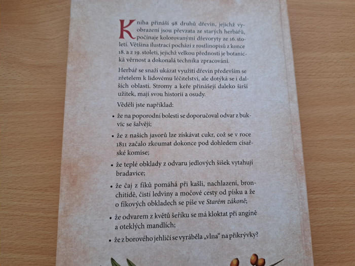 --2928-- Kniha ukazuje možnosti využitia drevín s prihliadnutím na ľudové liečiteľstvo ale aj v iných oblastiach. Ich vyobrazenia sú prevzaté zo starých herbárov, počínajúc kolorovanými drevorytmi zo 16. storočia. Väčšina ilustrácii pochádza z 18. a 19. storočia. Vydané v roku 2019, čisté, nepoškodené, bez poznámok. Cena 10,-- + poštovné. Pozrite si aj ostatné moje inzeráty.