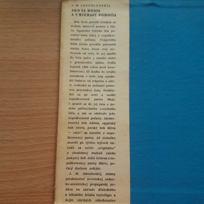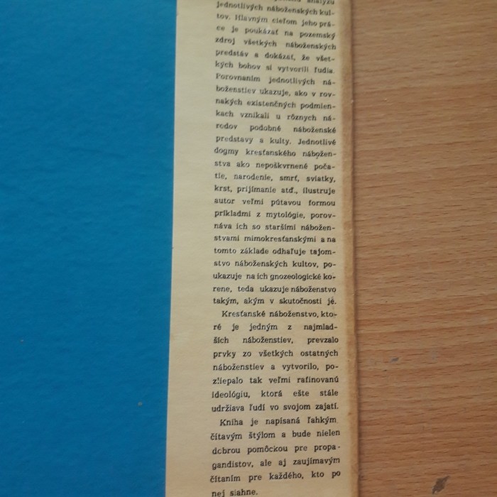 Autor, známy predstaviteľ sovietskej vedecko-ateistickej propagandy podáva na základe dôsledného a hlbokého štúdia mytológie a dejín všetkých náboženstiev stručnú, ale výstižnú analýzu jednotlivých náboženských kultúr. Jeho cieľom je poukázať na pozemský zdroj všetkých náboženských predstáv a dokázať, že všetkých bohov si vytvorili ľudia. Osveta 1960. Prebal je trochu ušpinený, inak dobrý stav. Venovanie. Cena 2,--+poštovné. Pozrite si aj ostatné moje inzeráty