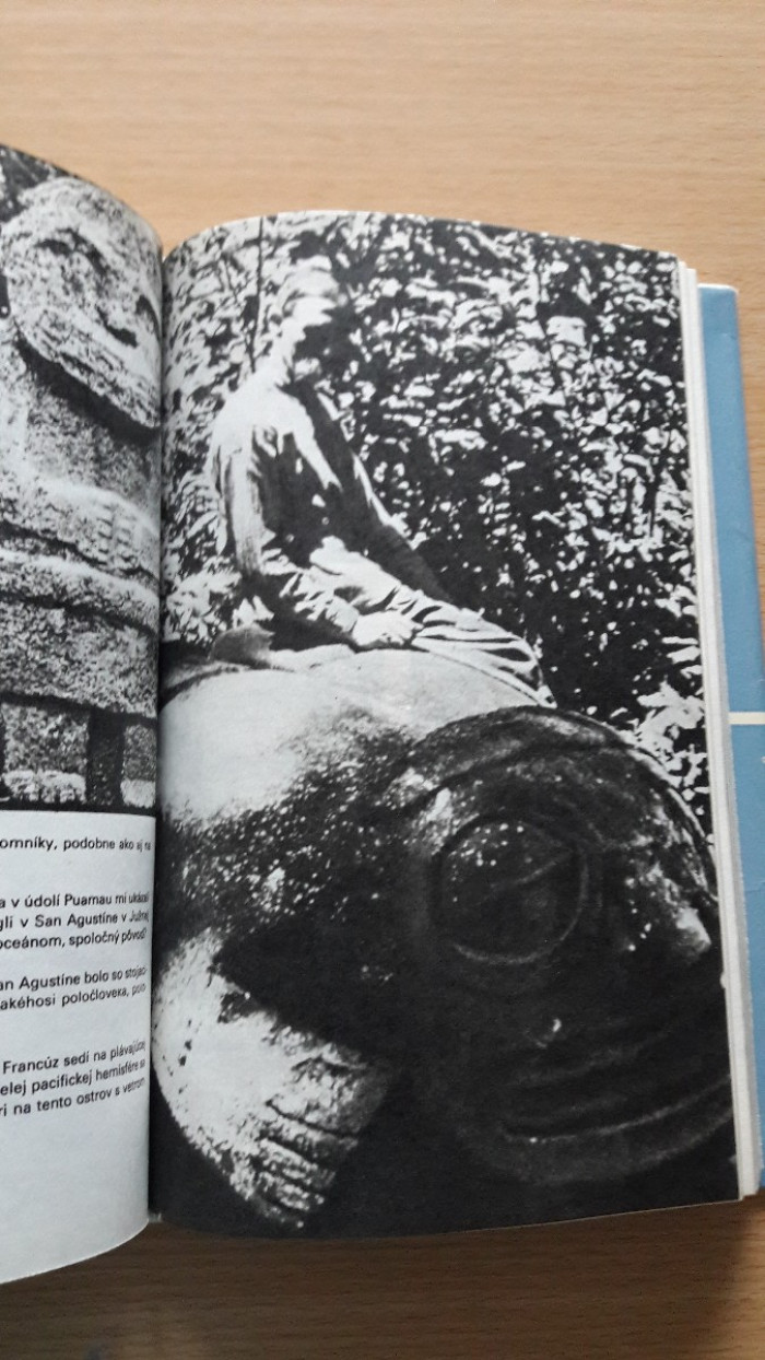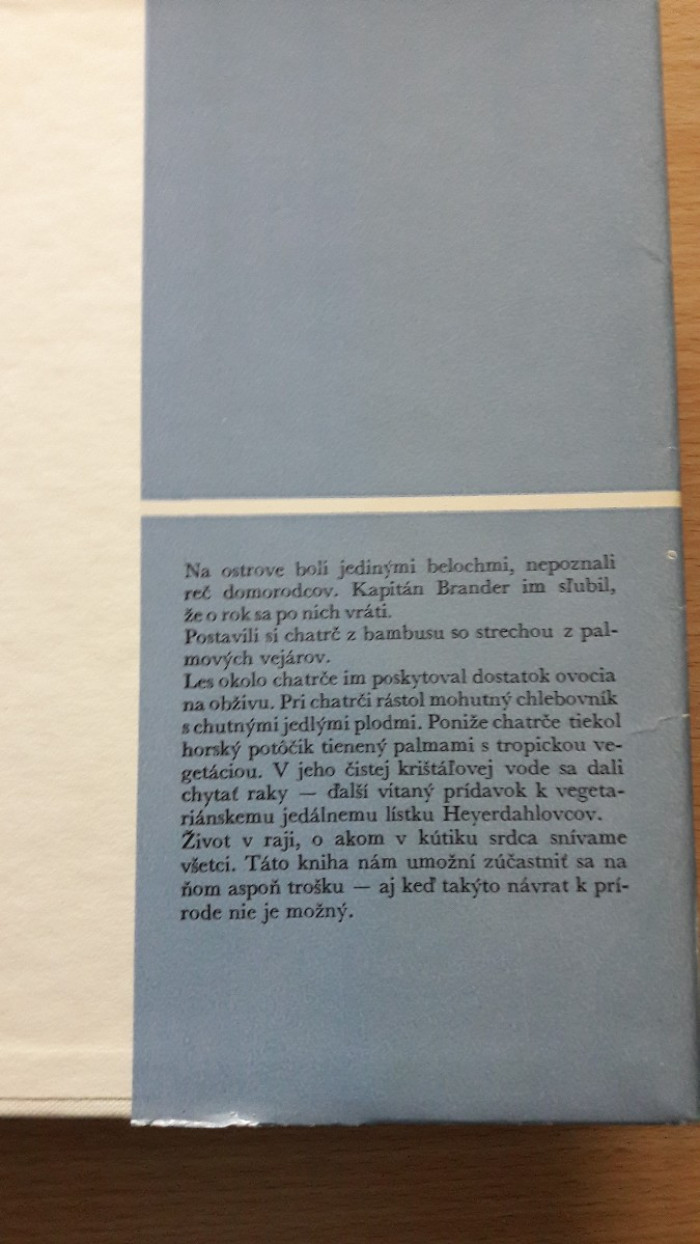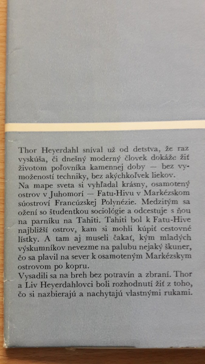 Thor Heyerdahl s manželkou prežívajú rok na ostrove, kde boli jedinými belochmi a nepoznali reč domorodcov. Žili v chatrči z bambusu, ktorú si postavili a živili sa tým, čo nazbierali a nachytali. Čiernobiele fotografie. Vydala Smena 1979. Prebal je trochu ochytaný inak pekný stav. Cena 5,--+poštovné. Pozrite si aj ostatné moje inzeráty