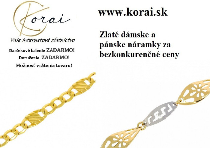Zlaté náramky najvyššej kvality za bezkonkurenčné ceny v internetovom obchode so šperkami Korai. Dámske a pánske náramky zo 14 karátového žltého zlata v rôznych dĺžok, vzoroch a šírkach za bezkonkurenčné ceny nájdete v internetovom zlatníctve Korai. Navštívte e - shop Korai a zaručene si vyberiete. Internetové zlatníctvo KORAI. E - shop Korai. E - shop Korai Vaše internetové zlatníctvo ponúka zlato, zlaté šperky. Internetové zlatníctvo Korai. Online šperky Korai, zlato, zlaté šperky. Online zlatníctvo Korai. E-shop Korai šperky. Online šperky Korai. Zlaté šperky Korai. Zlaté náramky Korai. Zlaté náramky. Náramky zo žltého 14 karátového zlata.