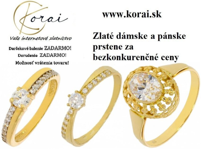 V ponuke internetového zlatníctva Korai nechýbajú ani zlaté prstene. Podobne ako iné zlaté šperky, aj zlaté prstene ponúkame v rôznych farebných prevedeniach a vzorov. Na výber sú prstene zo žltého zlata, prstene z bieleho zlata, ale aj prstene vyrobené kombináciou žltého a bieleho zlata. Výber je skutočne široký, od bezkameňových zlatých prsteňov, cez zlaté prstene s jedným kamienkom (vhodné aj ako zásnubné prstene), až po elegantné, luxusné zlaté prstene vykladané množstvom zirkónov. Navštívte internetové zlatníctvo Korai a zaručene si vyberiete. E-shop Korai. Navštívte e-shop Korai a zaručene si vyberiete. E-shop Korai Vaše internetové zlatníctvo ponúka zlato. Internetové zlatníctvo Korai. Online šperky Korai. Online zlatníctvo Korai. Online šperky Korai, striebro i zlato. Korai šperky. Zlaté prstene Korai. Zlaté prstene. Prstene zo žltého zlata Korai. Zlaté prstene Korai. Korai.
