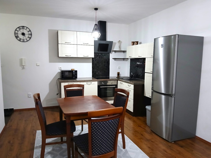• Kuchyňa spojená s obývačkou ((sporák, varná doska, rýchlovarná konvica, mikrovlna rúra, chladnička s mrazničkou, vysávač, práčka, televízor + internet)