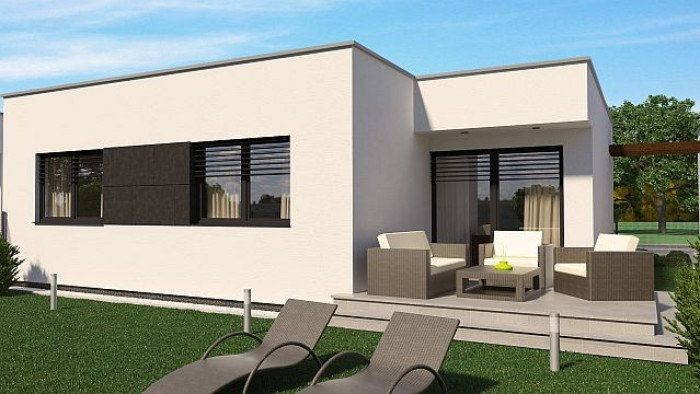 Dispozícia domu: vstupuje sa cez predsieň do chodby, z kadiaľ sú prístupné všetky obytné miestnosti rodinného domu. Z predsiene je prístup aj do WC a technickej miestnosti. Z chodby je prístupná denná časť, obývacia miestnosť s kuchyňou na jednej strane a na druhej strane je spálňa, druhé WC, kúpeľňa a na konci chodby dve izby. Z obývacej miestnosti je prístup na terasu.