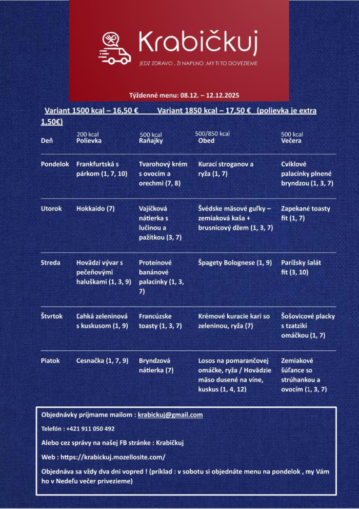 Komplet denné menu (1500 kcal) za 16,50 € (polievka sa objednáva extra)